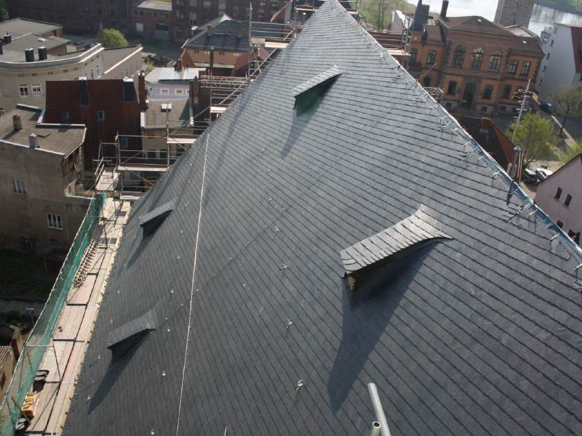 Fast 160 Jahre trotzte das Dach dem Wetter. In der Folge sind einzelne immer größer werdende Bereiche undicht. Schieferschindeln haben sich aufgestellt und im Bereich zum Südturm ist die Dachfläche zum Turm hin abgerissen.