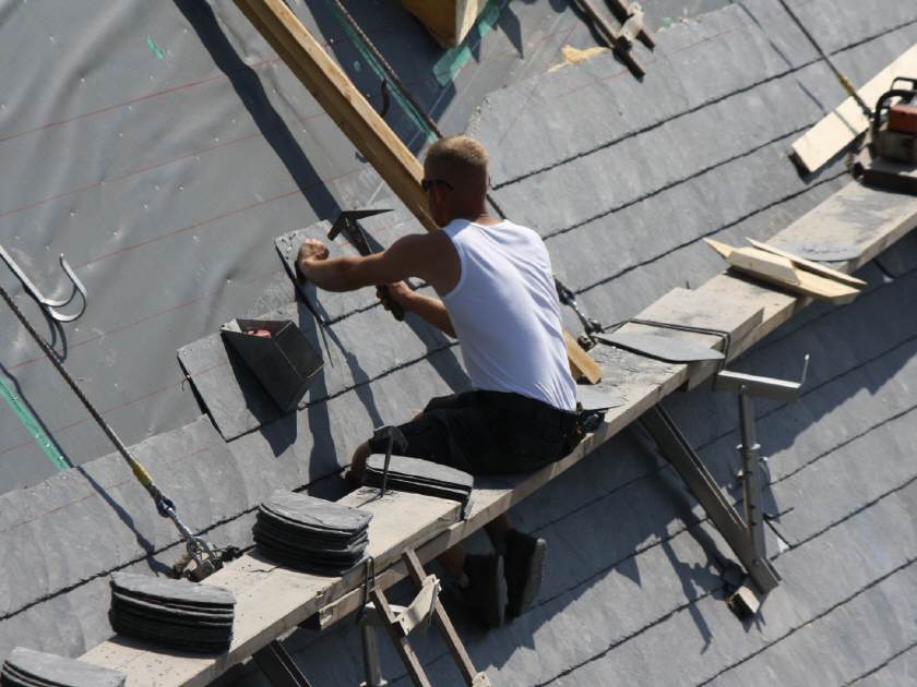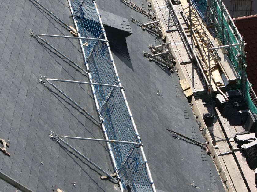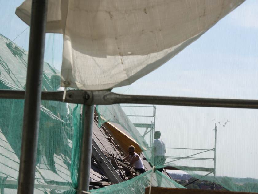Die Dachdeckerarbeiten sind im Norddachbereich mit der Aufnahme der alten Dachhaut gut fortgeschritten. Die Unterdachkonstruktion in diesem Bereich ist bereits saniert. Nunmehr werden die neuen Dachgauben errichtet. Die Schieferneueindeckung steht kurz bevor.